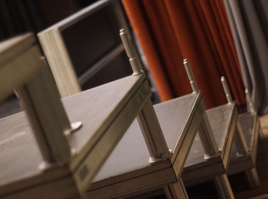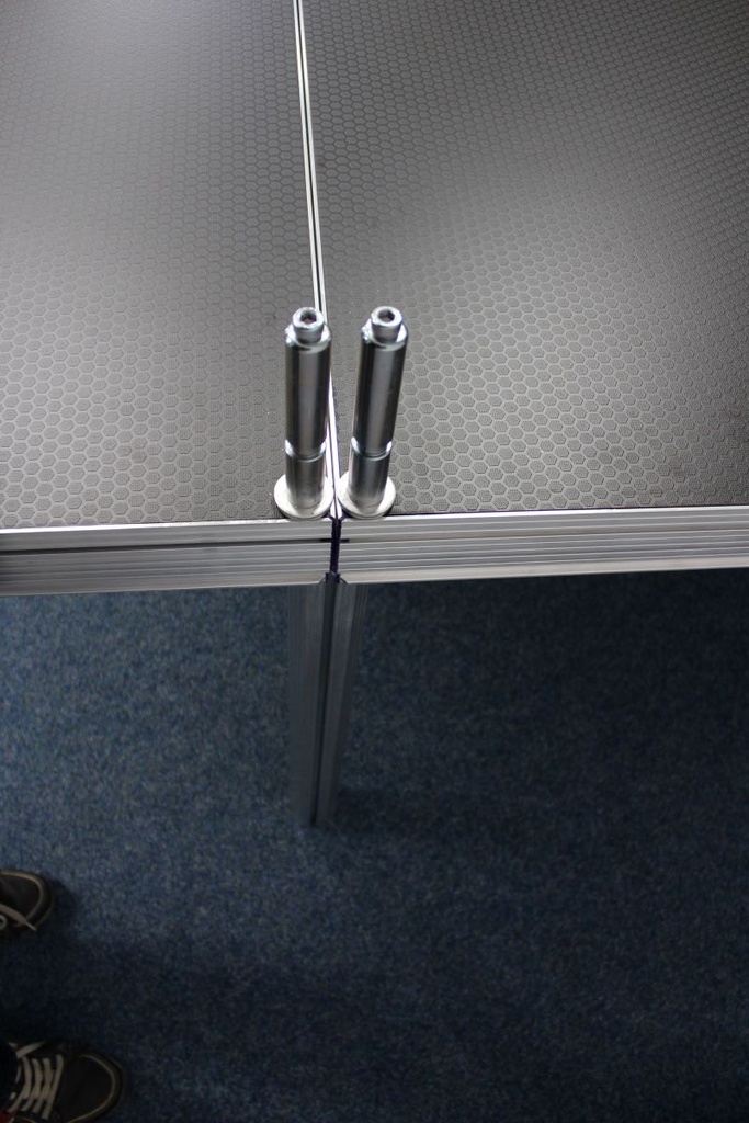 TOMKOstage system offers an easy and fast solution of setting up stage rails. How to mount the rails: the screws around the perimeter of the stage that connect legs and decks are replaced by rail support bolts. Rails can then simply slide on and are secured by small screws preventing their removal. Stage rails are connected between one another by rail connectors so that they won´t shift apart.